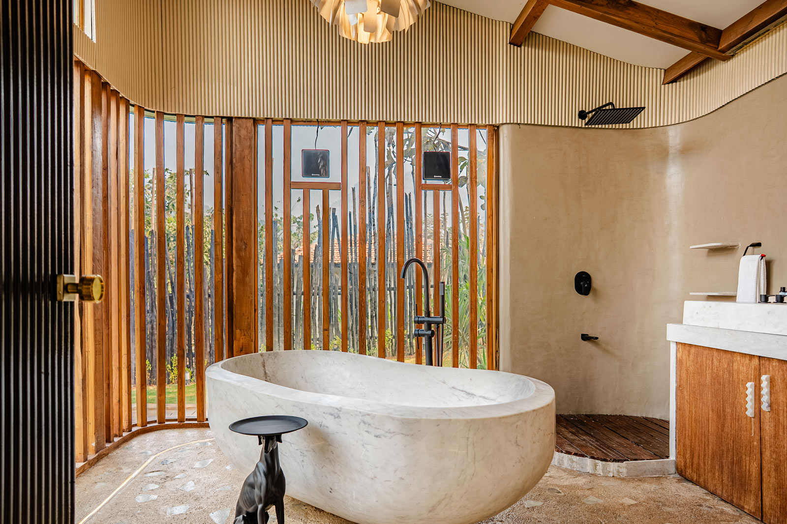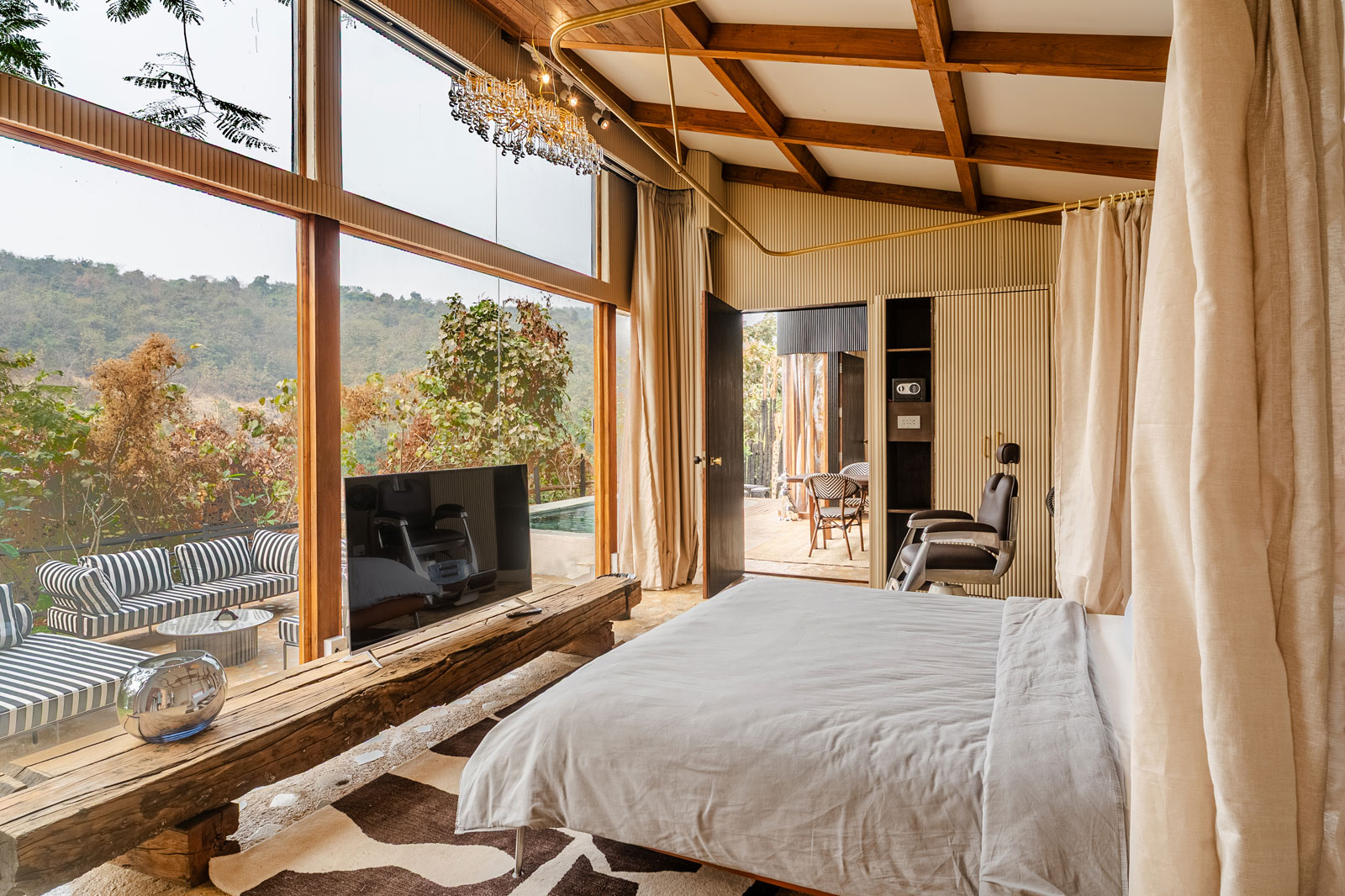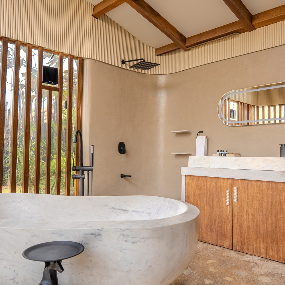 A serene cabin designed with soft curves, natural textures, and seamless indoor-outdoor flow creates a calming, intuitive experience. Grounded materials, quiet luxury, and effortless transitions—from bath to patio to pool—make the space feel honest, unforced, and memorable long after you leave.